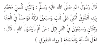 Rosululloh SAW bersabda: demi Tuhan yang menguasai jiwa Muhammad, sungguh umatku nanti akan pecah menjadi 73 golongan, satu golongan masuk surga dan yang 72 golongan akan masuk neraka, seorang sahabat bertanya, “Siapakah mereka yang masuk surga itu, ya Rosulalloh? “ Rosul menjawab “Mereka itu adalah Ahlus Sunnah wal Jama’ah.“ (H.R. Imam Thobroni).