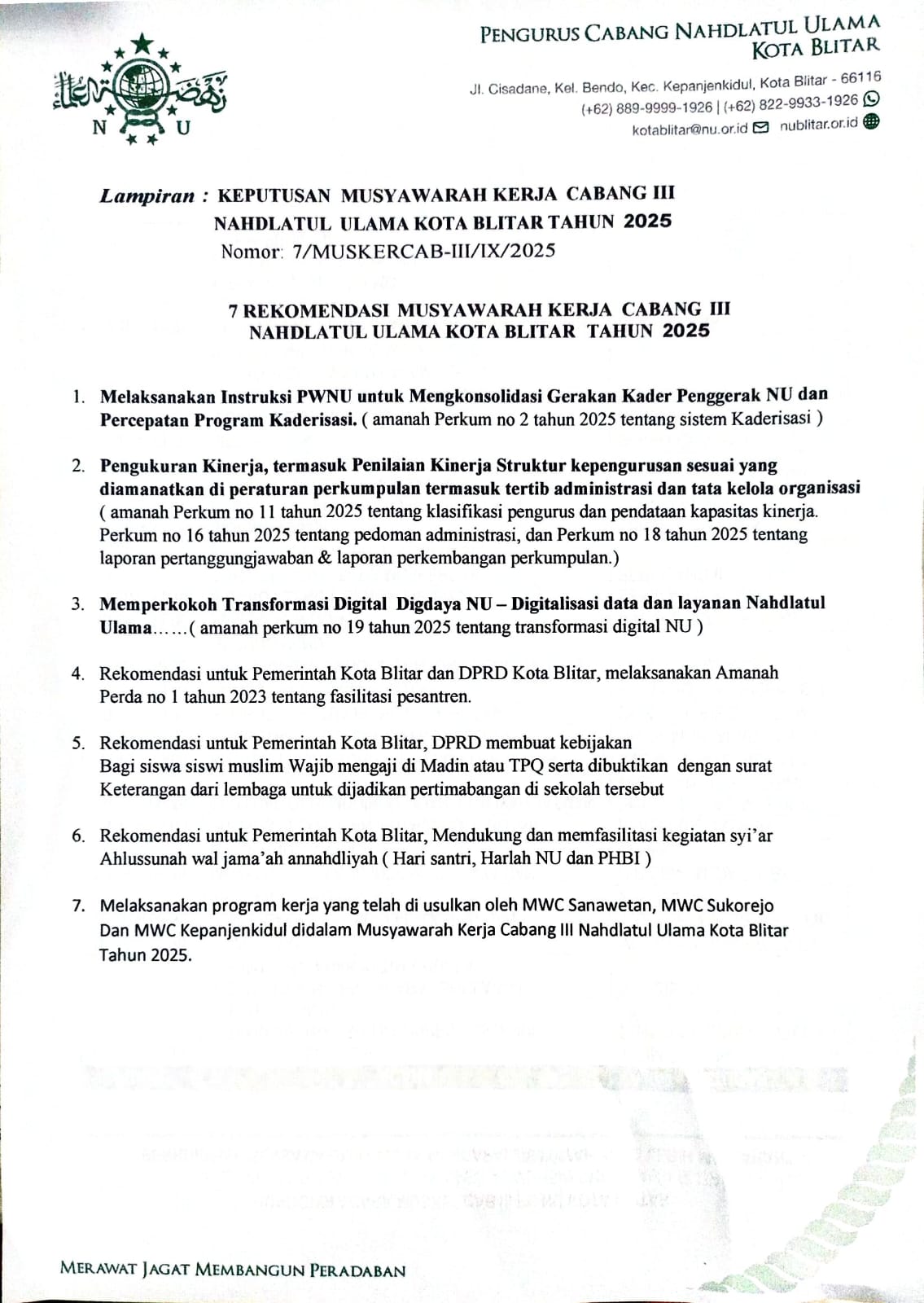 Dari hasil pembahasan, Muskercab III NU Kota Blitar Tahun 2025 menghasilkan tujuh rekomendasi penting sebagai keputusan resmi, yakni: