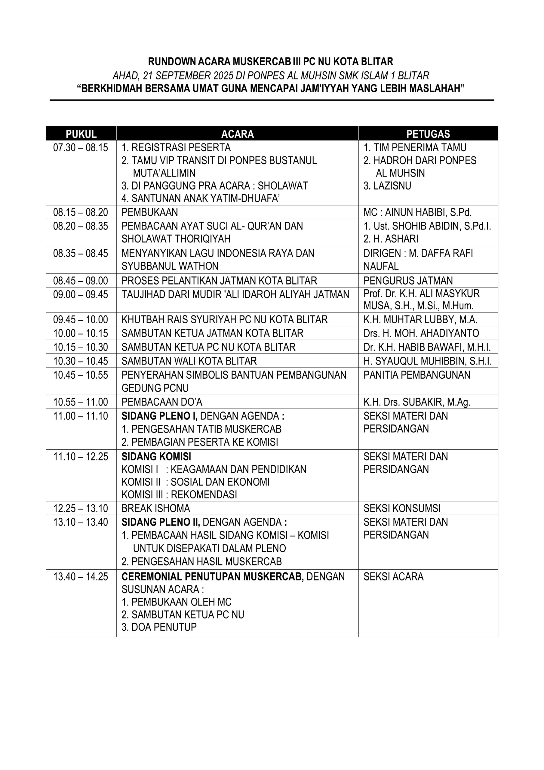 Blitar – Pengurus Cabang Nahdlatul Ulama (PCNU) Kota Blitar menyelenggarakan Musyawarah Kerja Cabang (Muskercab) III pada Ahad (21/9/2025) di Pondok Pesantren Al-Muhsin, SMK Islam 1 Blitar. Kegiatan ini mengusung tema “Berkhidmah Bersama Umat Guna Mencapai Jam’iyyah yang Lebih Maslahah.”